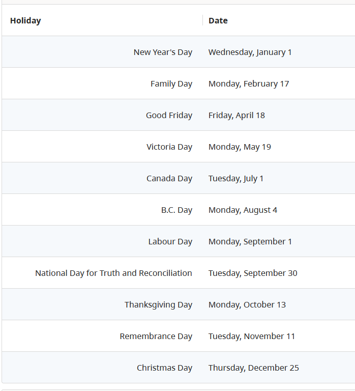 Monday - Friday 9:00am to 5:00pm / Saturday 9:00am to 4:00pm. Closed all Statutory Holidays