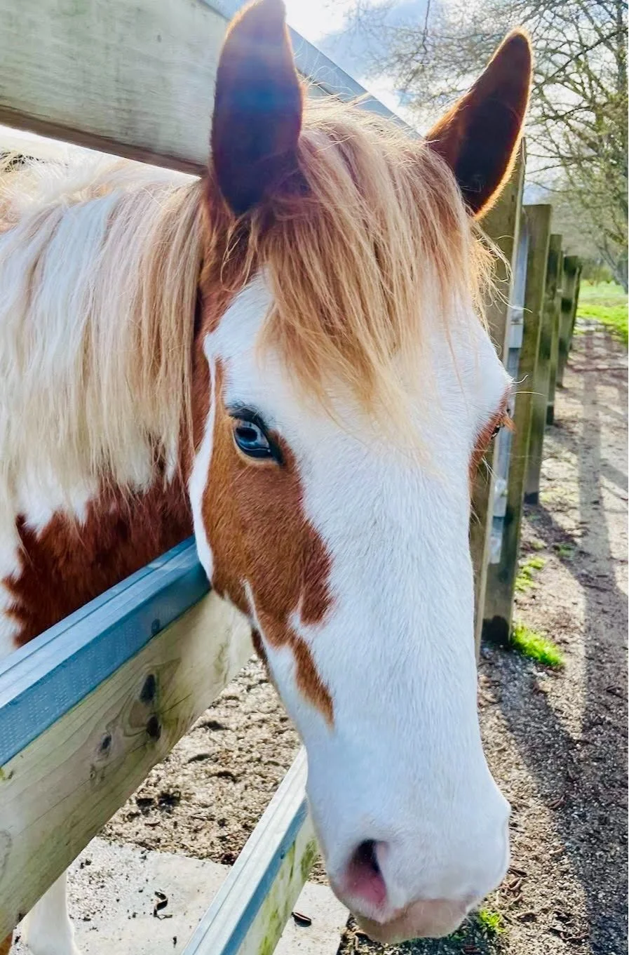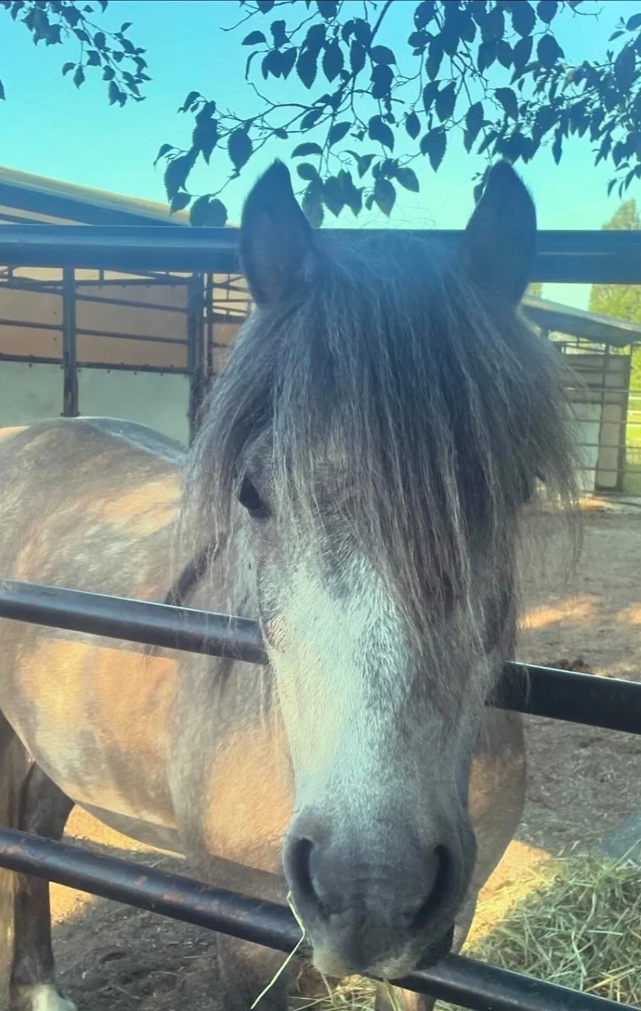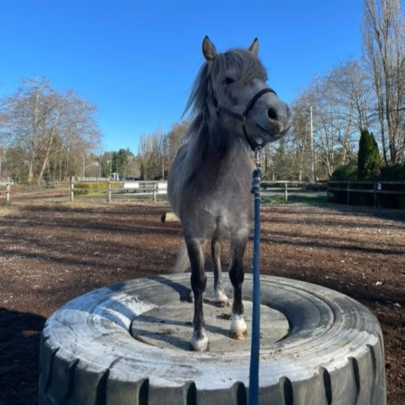 He has a gentle soul, loves to smile and has a kind eye (one blue and one brown). Oliver was rescued from the Dawson Creek Auction in 2022. This auction routinely sells horses and ponies for meat export, so we are so grateful to have been able to give him a second chance.
