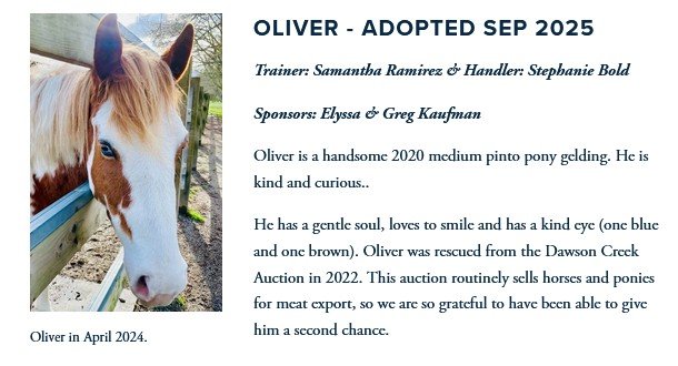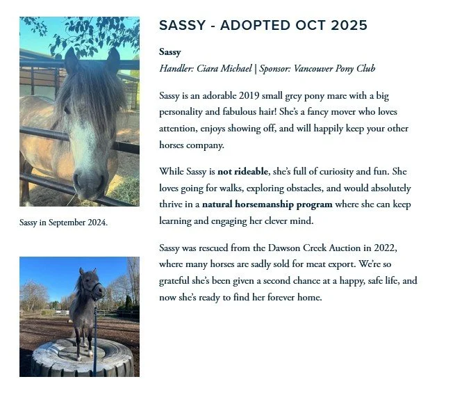 Piccadilly is a beautiful 2019 medium palomino pony mare who became a part of our rescue program in 2022. Together with Oliver and Sassy, she was rescued from the Dawson Creek Auction, an auction that routinely sells horses and ponies for meat export. Piccadilly is very sweet, naturally curious, and a favourite of our volunteers. In 2024, Margot Vilvang took over Piccadilly’s training and with the help of Alex Niu, Piccadilly was Reserve Champion in the flat and trot pole classes at our June Hunter Jumper show. In August she caught the eye of Southlands resident Lori Rowe as a potential pony for her granddaughter. Piccadilly had a very successful meeting with Lori and her family, and we are happy to report that Lori purchased her in September, and she is now a resident of Hampton Stables. We are so happy for Piccadilly, who has secured a loving home and will continue in a wonderful training program with Margot.