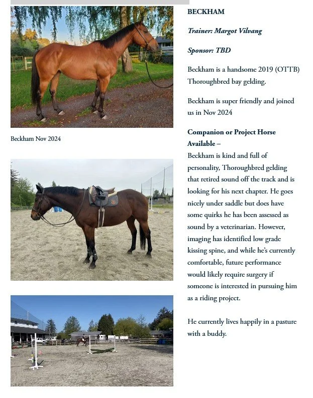 In the summer of 2020, Denver caught the eye of SRC member Bridget Martin, who felt he would be a great fit for “someone in her program”. That someone turned out to be our past SRC president, Whitney Santos. Bridget and Whitney, together with SRC member and past vice-president Tina Berthaudin, spent June and July riding and training Denver. He was purchased by Whitney in July 2020. Denver then moved to Straight-Up Stables on Celtic, where he was pampered and loved by the boarders and trainers. Bridget took him in several dressage shows, out to Campbell Valley Park for a day and taught Whitney and Tina in countless lessons. Denver will spend the winter and spring with Nancy and Amanda Brook at Wildwood Paddocks in Lumby. He will return to Southlands in the spring, for more time with “Team Denver”.